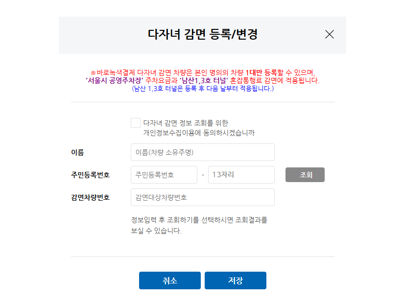 5. 다자녀등록/변경 버튼을 클릭하여 개인정보 및 차량 정보를 입력한 후 저장 버튼을 클릭합니다.